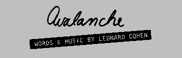 capo on 1 Fm e:--------1--------1--------1--------1--------1--------1--------1--------1--| B:-----1--------1--------1--------1--------1--------1--------1--------1-----| G:-----------1-----------------1-----------------1-----------------1--------| D:--3-----------------------------------3-----------------------------------| A:--------------------3-----------------------------------3-----------------| E:--------------------------------------------------------------------------| p i m p i m etc. 4/4 beat Avalanche /Fm /Fm / /Fm /Db Well I stepped into an avalanche, /Fm Eb 3fr. /Fm it covered up my soul; /Fm /Db when I am not this hunchback that you see, /Fm Eb 3fr. /Fm I sleep be-neath the golden hills. /Ab /Gm You who wish to conquer pain, /Fm /Bb /Ab / Cm /Cm /Cm/ you must learn, learn to serve me well. /Fm /Db You strike my side by ac-cident /Fm Eb 3fr. /Fm as you go down for your gold. /Fm /Db The cripple here that you clothe and feed /Fm Eb 3fr. /Fm is neither starved nor cold; /Ab /Gm he does not ask for your company, /Fm /Db /Db /Db /Db /Cm not at the centre, the centre of the world. /Fm etc. When I am on a pedestal, you did not raise me there. Your laws do not compel me to kneel grotesque and bare. I myself am the pedestal for this ugly hump at which you stare. You who wish to conquer pain, you must learn what makes me kind; the crumbs of love that you offer me, they're the crumbs I've left behind. Your pain is no credential here, it's just the shadow, shadow of my wound. I have begun to long for you, I who have no greed; I have begun to ask for you, I who have no need. You say you've gone away from me, but I can feel you when you breathe. Do not dress in those rags for me, I know you are not poor; you don't love me quite so fiercely now when you know that you are not sure, it is your turn, beloved, it is your flesh that I wear.