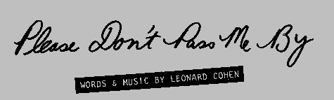 spoken I was walking in New York City and I brushed up against the man in front of me. I felt a cardboard placard on his back. And when we passed a streetlight, I could read it, it said "Please don't pass me by - I am blind, but you can see - I've been blinded totally - Please don't pass me by." I was walking along 7th Avenue, when I came to 14th Street I saw on the corner curious mutilations of the human form; it was a school for handicapped people. And there were cripples, and people in wheelchairs and crutches and it was snowing, and I got this sense that the whole city wassinging 4/4 A /A singing this: /A /E7 /A /A Oh please don't pass me by, /A /E7 /A /A7 oh please don't pass me by, /D /D /A /A for I am blind, but you can see, /D /D /A /A yes, I've been blinded totally, /A /E7 /A /A / oh please don't pass me by.spoken And you know as I was walking /A 9 times/ or ad lib I thought it was them who were singing it, I thought it was they who were singing it, I thought it was the other who was singing it, I thought it was someone else. But as I moved along I knew it was me, and that I was singing it to myself. It went: /A /E7 /A /A Please don't pass me by ... /A 27 times/ or ad lib. Now I know that you're sitting there deep in your velvet seats and you're thinking "Uh, he's up there saying something that he thinks about, but I'll never have to sing that song." But I promise you friends, that you're going to be singing this song: it may not be tonight, it may not be tomorrow, but one day you'll be on your knees and I want you to know the words when the time comes. Because you're going to have to sing it to yourself, or to another, or to your brother. You're going to have to learn to sing this song, it goes: /A /E7 /A /A Please don't pass me by ... /A 21 times/ or ad lib. Well I sing this for the Jews and the Gypsies and the smoke that they made. And I sing this for the children of England, their faces so grave. And I sing this for a saviour with no one to save. Hey, won't you be naked for me? Hey, won't you be naked for me? It goes: /A /E7 /A /A Please don't pass me by ... /A 16 times/ or ad lib. Now there's nothing that I tell you that will help you connect the blood tortured night with the day that comes next. But I want it to hurt you, I want it to end. Oh, won't you be naked for me? Oh now: /A /E7 /A /A Please don't pass me by ... /A 20 times/ or ad lib. Well I sing this song for you Blonde Beasts, I sing this song for you Venuses upon your shells on the foam of the sea. And I sing this for the freaks and the cripples, and the hunchback, and the burned, and the burning, and the maimed, and the broken, and the torn, and all of those that you talk about at the coffee tables, at the meetings, and the demonstrations, on the streets, in your music, in my songs. I mean the real ones that are burning, I mean the real ones that are burning /A /E7 /A /A Oh please don't pass me by, /A /E7 /A /A7 oh now please don't pass me by, /D /D /A /A for I am blind, yeah but you you can see, /D /D /A /A Oh now, I've been blinded totally, /A /E7 /A /A / oh now please don't pass me by.spoken I know that you still /A 4 times/ or ad. lib. think that its me. I know that you think that there's somebody else. I know that these words aren't yours. But I tell you friends that one day You're gonna /A 17 times/ or ad lib. to get down on your knees, you're gonna to get down on your knees, you're gonna to get down on your knees, you're gonna to get down on your knees, you're gonna to get down on your knees, you're gonna to get down on your knees, you're gonna to get down on your knees, you're gonna to get down on your knees, you're gonna to get down Oh /A /E7 /A /A Please don't pass me by ... /A 16 times/ or ad lib. Well you know I have my songs and I have my poems. I have my book and I have the army, and sometimes I have your applause. I make some money, but you know what my friends, I'm still out there on the corner. I'm with the freaks, I'm with the hunted, I'm with the maimed, yes I'm with the torn, I'm with the down, I'm with the poor. Come on Oh /A /E7 /A /A Oh Please don't pass me by (spoken : I gonna go now friends) /A /E7 /A /A7 but, please don't pass me by, /D /D /A /A for I am blind, yeah but you you can see, /D /D /A /A oh, I I've been blinded, I've been blinded totally, /A /A /A /A oh now, please don't pass me by. Now I want to take away /A 33 times/ or ad lib. my dignity, yes take my dignity. My friends, take my dignity, take my form, take my style, take my honour, take my courage, take my time, take my time, .. time .. 'Cause you know I'm with you singing this song. And I wish you would, I wish you would, I wish you would go home with someone else. Wish you'd go home with someone else. I wish you'd go home with someone else. Don't be the person that you came with. Oh, don't be the person that you came with, Oh don't be the person that you came with. Ah, I'm not going to be. I can't stand him. I can't stand who I am. That's why I've got to get down on my knees. Because I can't make it by myself. I'm not by myself anymore because the man I was before he was a tyrant, he was a slave, he was in chains, he was broken and then he sang: /A /E7 /A /A Oh, please don't pass me by, /A /E7 /A /A7 oh, please don't pass me by, /D /D /A /A for I am blind, yes I am blind, Oh but you can see, /D /D /A /A yes, I've been blinded totally, /A /E7 /A /A oh, please don't pass me by. Well I hope I see you out there on /A 4 times/ or ad lib. the corner. Yeah I hope as I go by that I hear you whisper with the breeze. Because I'm going to leave you now, I'm going to find me someone new. Find someone knew. /A /E7 /A /A ad lib. And please don't pass me by.picture from the seventies 60 K